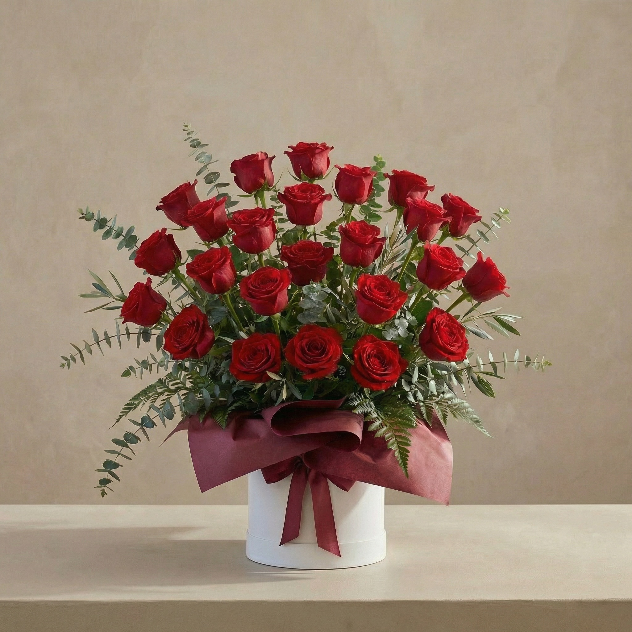 Featuring twenty-four premium long-stem red roses, this luxurious arrangement is styled in a compact, bouquet-style composition for a full, lush finish. The roses are carefully layered and supported by complementary foliage to create depth and texture, while maintaining a refined, balanced silhouette.