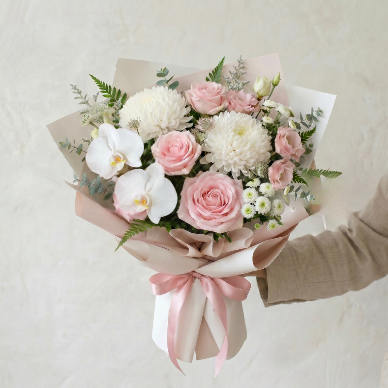 Featuring premium roses in delicate blush pink tones, paired with crisp white chrysanthemum disbud mums and soft pink lisianthus, this bouquet is finished with seasonal filler flowers in gentle blush and white hues for a light, romantic feel.