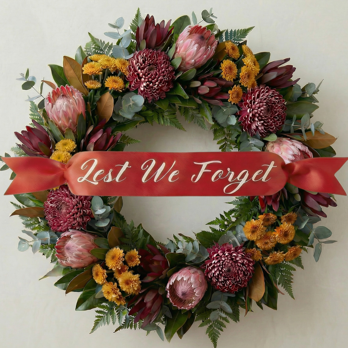 Our Premium Tribute Wreath is a classic remembrance design created to honour those who served and sacrificed for our country. This wreath features a lush base of fresh seasonal greenery complemented by carefully selected flowers, creating a dignified and respectful tribute suitable for Anzac Day & Remembrance Day services and commemorative ceremonies.
