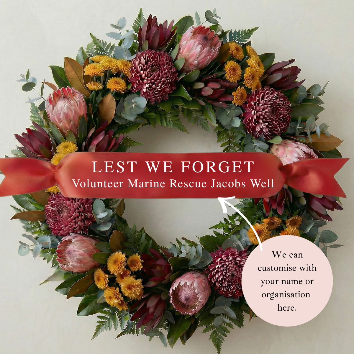 | Ribbon | "Custom Ribbon Text", Purple Satin "Lest We Forget", Red Satin "We Will Remember Them" |
